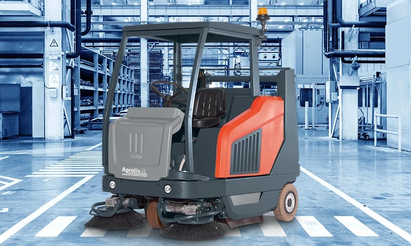 Balayeuse aspiratrice autoportée pour grandes surfaces industrielles
