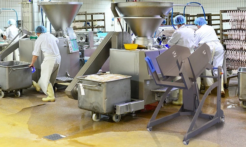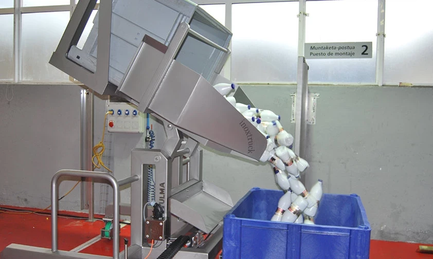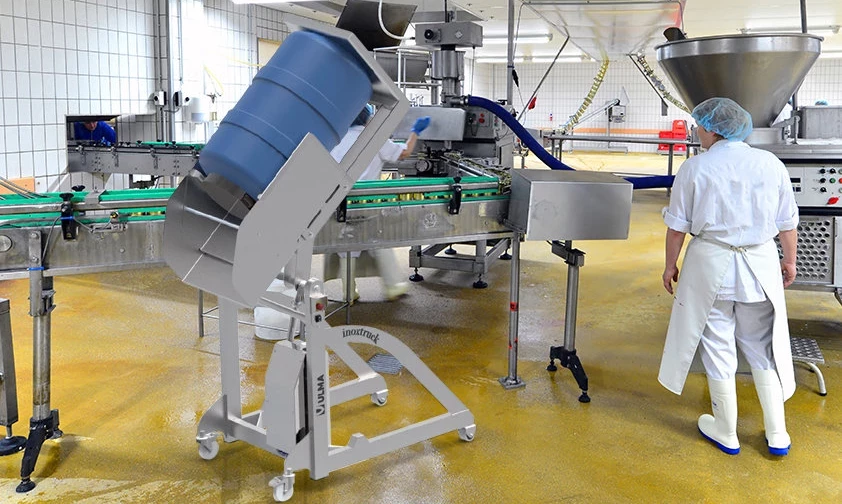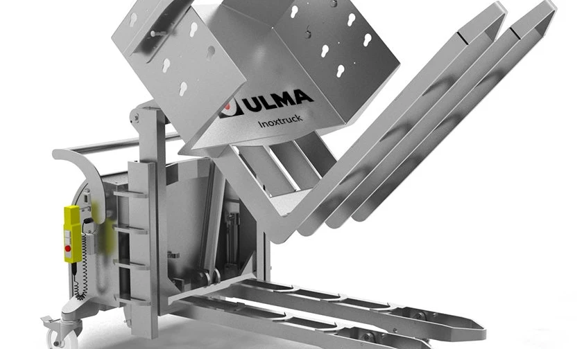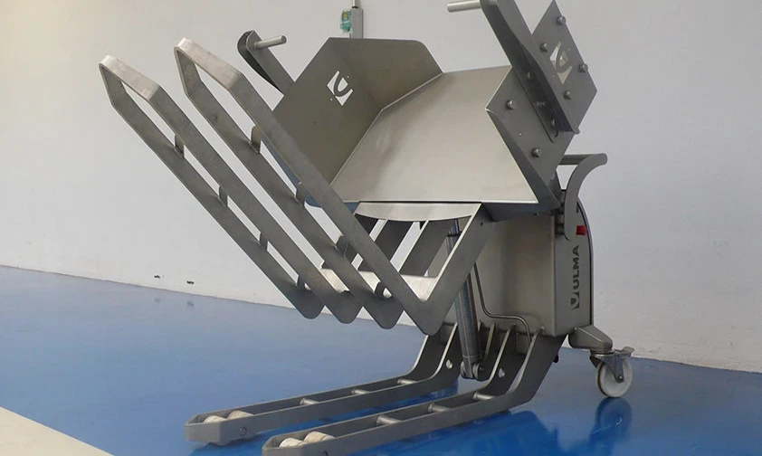 Les retourneurs et basculeurs ULMA Inoxtruck sont dotés d’un système d’inclinaison allant jusqu'à 130° qui permet de manipuler et de renverser des charges telles que des bidons, des chariots cutter ou des eurobins sur des convoyeurs à bandes, dans les conteneurs, les pétrins, les broyeurs, les mélangeurs et les bacs Europe de manière totalement ergonomique et en réduisant les efforts.